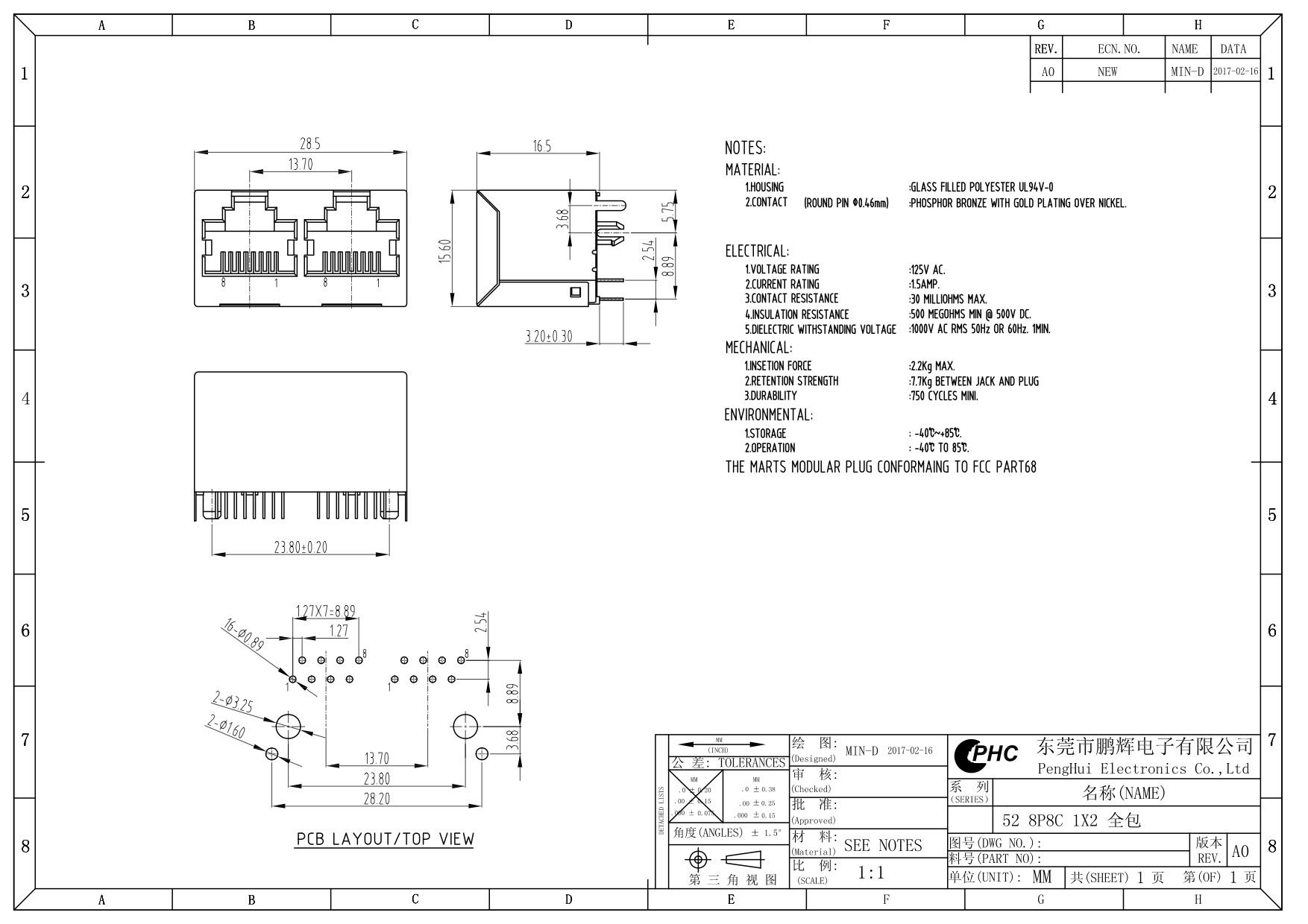 | Housing: | GLASS FILLED POLYESTER UL94V-0 | CONTACT: | PHOSPHOR BRONZE WITH GOLD PLATING OVER NICKEL |